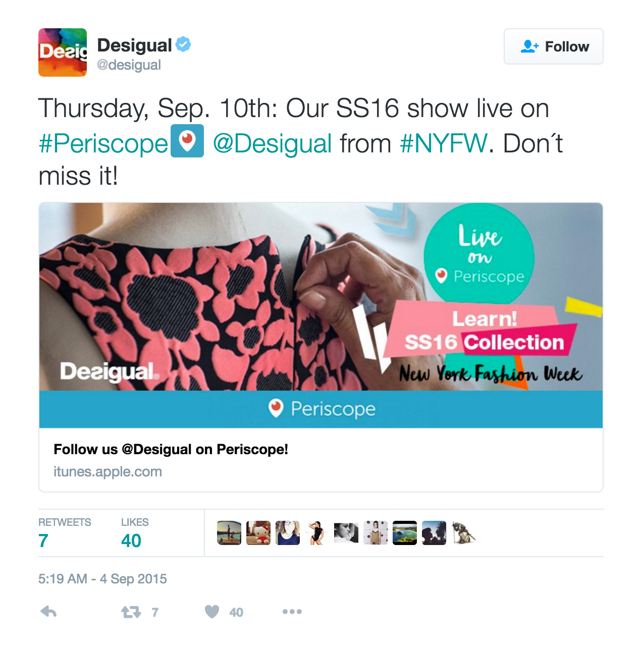 @desigual wurde eines der ersten Unternehmen weltweit, das mit der Periscope -App ein Live-Video vom Laufsteg und gleichzeitig einen Blick hinter die Kulissen bot. Die innovative Möglichkeit der Live-Übertragung bietet Nutzern eine neue Erfahrung und trägt zum Image des Unternehmens als Innovator der Modewelt bei.