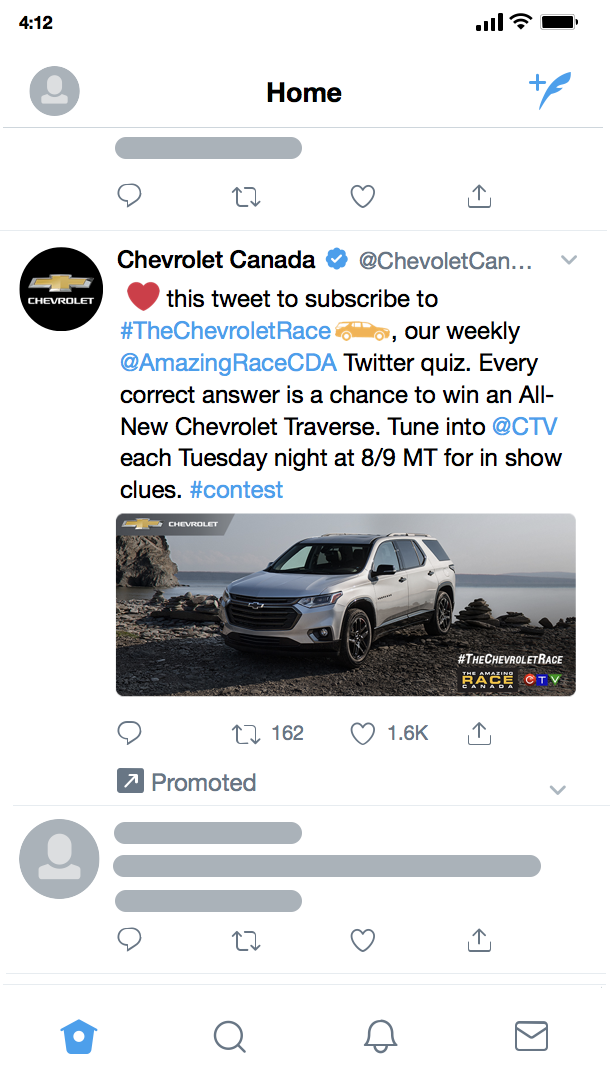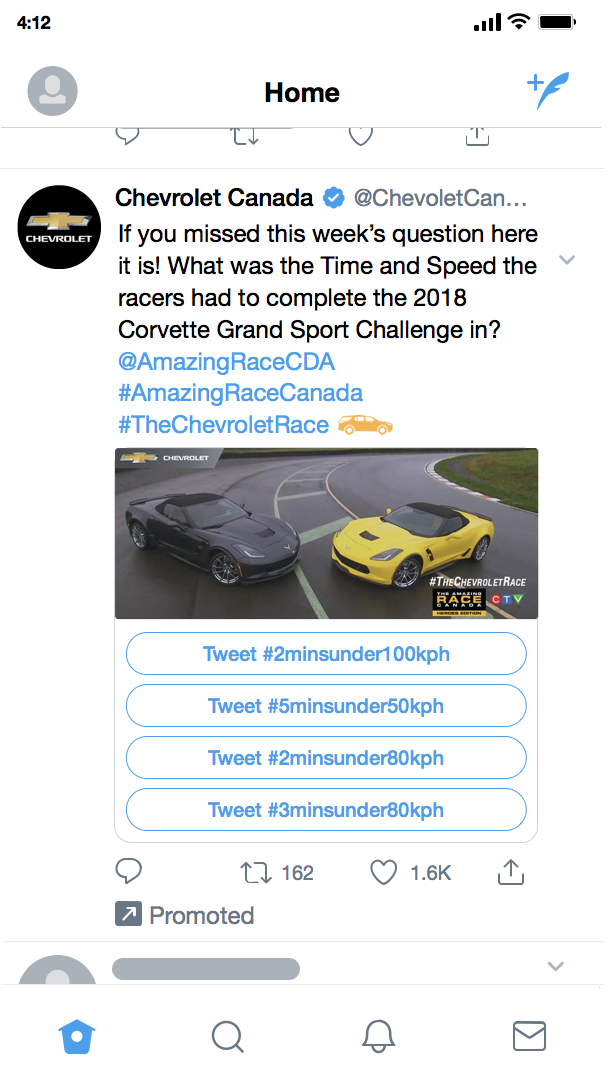 #TheChevroletRace invited Canadians to participate in a weekly contest that ran concurrently with the show. With the chance to win the all-new Chevrolet Traverse, Chevrolet connected with its target audience using Promoted Tweets to announce #TheChevroletRace and remind fans to tune in. Every Tuesday night when “The Amazing Race Canada” aired, Chevrolet used TV spots on Bell Media to drive viewers to Twitter to enter. Once on Twitter and reaching the audience of @AmazingRaceCDA, Chevrolet engaged users with weekly quiz questions in the form of a Conversational Card. Every right answer brought fans one step closer to being named the ultimate #TheChevroletRace winner. Chevrolet further doubled down with Sponsored Moments recapping every episode to engage fans and drive brand mentions.