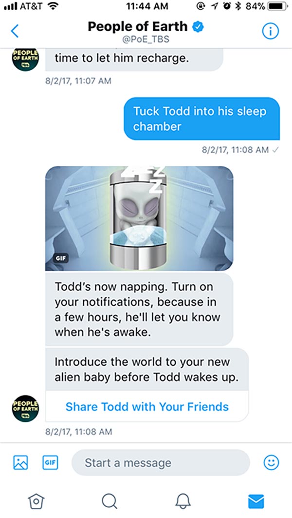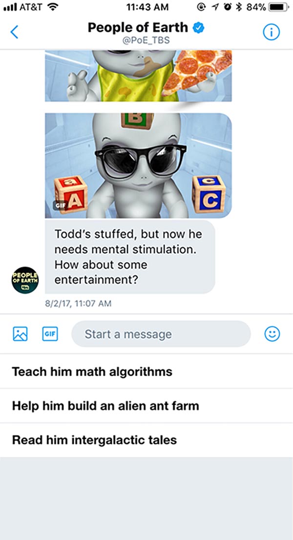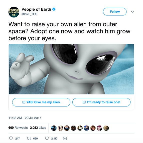 Get ready for a visit from another planet: For the second season of “People of Earth” (@PoE_TBS), TBS (@TBSNetwork) wanted to increase awareness of and interest in the show in an extraterrestrial way. To get people more personally engaged with the story, TBS created an out-of-this-world experience that would let people adopt an alien from outer space through a chatbot in Direct Messages. An adopted alien needs attention though: Its newfound caretaker would need to feed, entertain, and put the alien baby to bed.