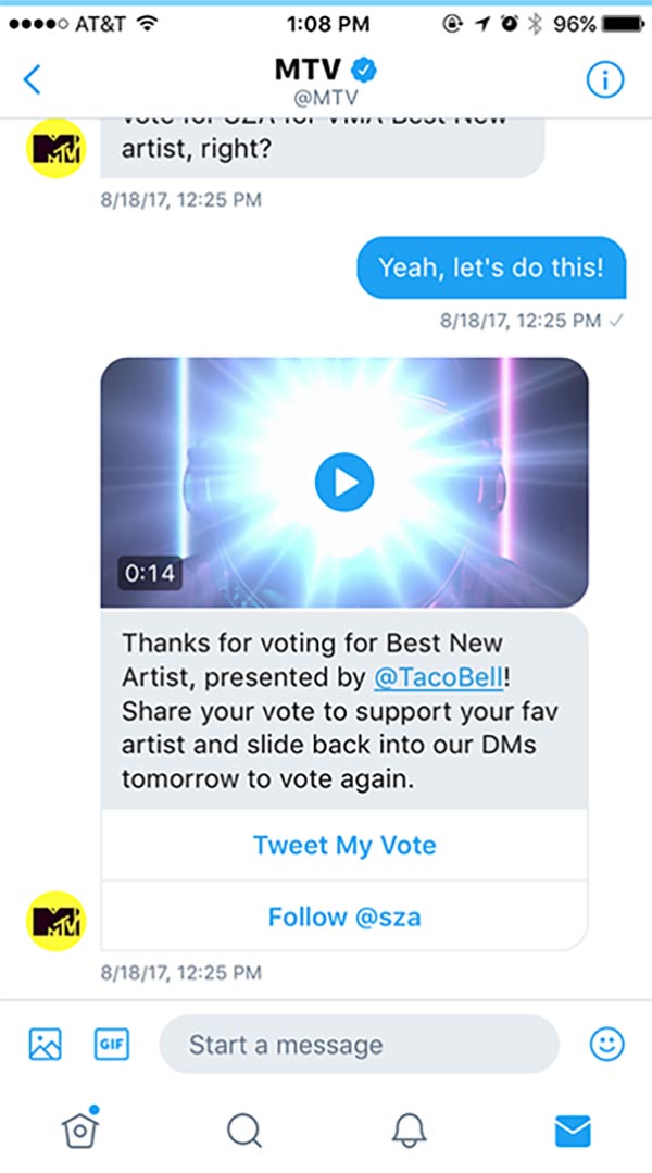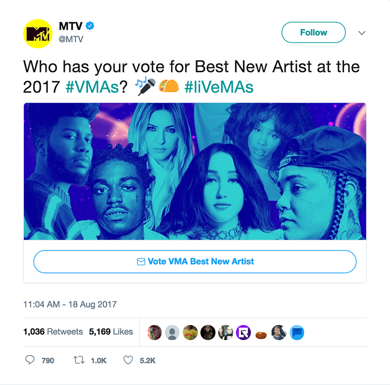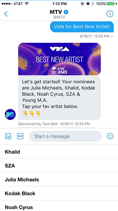 For emerging artists, the Best New Artist award at MTV’s Video Music Awards is an enormous opportunity to break through to new audiences. Not only is it a career game-changer for artists, it’s also a fantastic way for fans to participate in the awards show. In 2017, MTV (@MTV) and Taco Bell (@tacobell) teamed up to create a unique experience on Twitter that would let fans vote for their favorite nominated artist in Direct Messages.