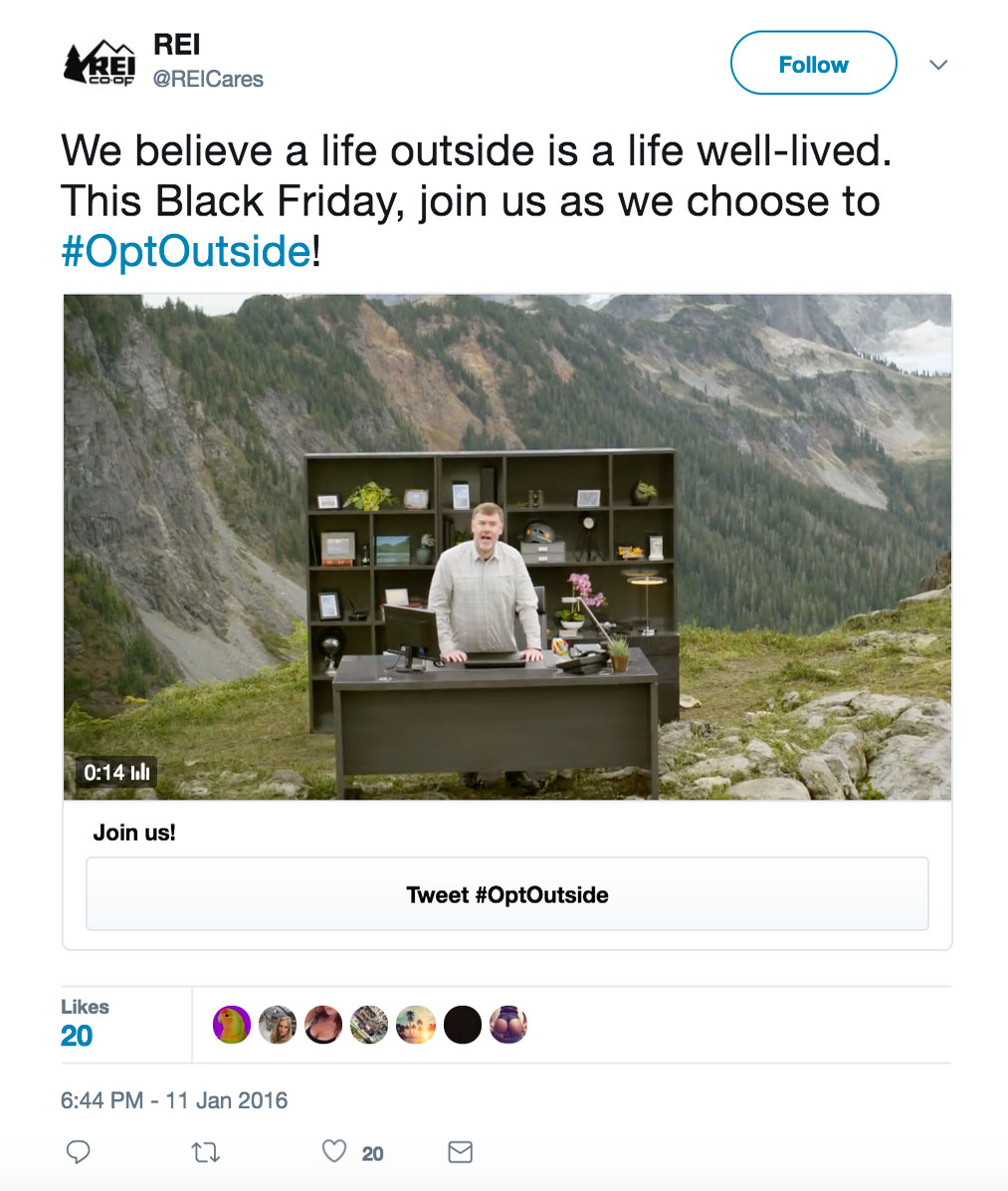 Based on this insight, REI’s strategy focused on helping this audience avoid the Black Friday crowds and do something aligned with REI’s purpose: spend the day outside. This insight and strategy were easily validated on Twitter, where many had shared their desire for a more meaningful Black Friday tradition.