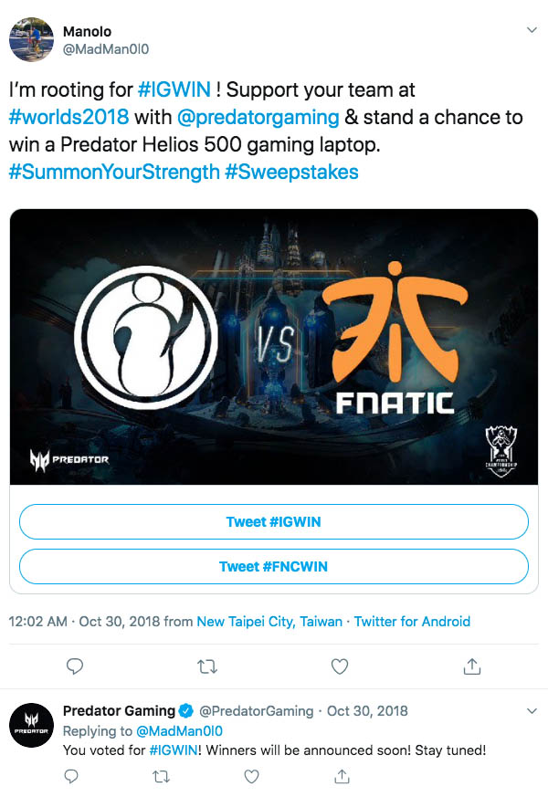 Starting a week before the semifinals and leading up to the finals of #Worlds2018, @PredatorGaming invited fans to show their support for their favourite LOL teams. By simply clicking on a team name in a Conversational Ad, a fan could generate a new auto-populated Tweet for his or her own followers, organically extending the #SummonYourStrength campaign to a wider audience. They would then receive a personalised thank-you Tweet inviting them to engage further and complete their sweepstakes entry by Direct Message.