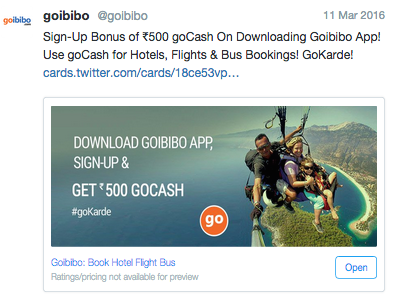 Goibibo utilised a variety of Twitter solutions to attract an influential mobile audience in India. It created Promoted Videos and Promoted Tweets with Video App Cards to raise brand awareness and generate audience engagement on Twitter. To reach a wider audience beyond Twitter, @goibibo extended its mobile app promotion campaigns to the Twitter Audience Platform to deploy native third-party in-app, interstitial and banner ads across thousands of Twitter partner apps. This enabled the brand to achieve scale based on its target budget. Goibibo targeted people based on the usernames they follow, with interests in travel, sports, finance, and tailored audiences, after testing multiple targeting options with Twitter, to achieve an optimal balance between scaling its reach to high lifetime value app users while driving efficient high-quality app installs.