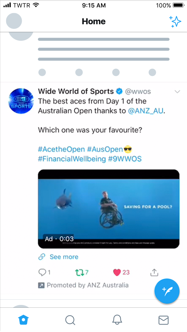 To promote its partnership with #AusOpen, ANZ opted for an In-Stream Video Sponsorship of the Australian Open on Wide World of Sports (@WWOS), a part of Channel Nine. Finally, ANZ boosted its messaging through Promoted Video, targeted to key audiences.