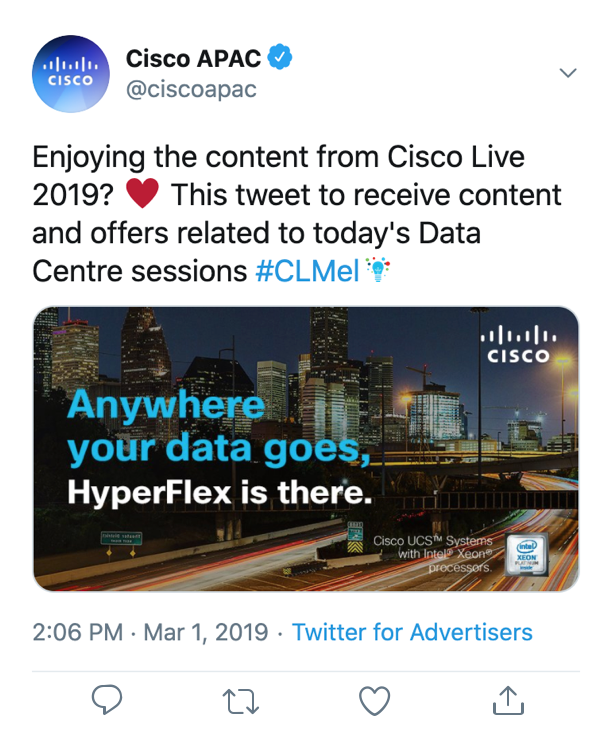 Post-event, Cisco sent 2.8K Tweets containing exclusive content and offers to those who had clicked Like to Subscribe, helping the brand to extend the conversation and engagement well beyond the duration of Cisco Live 2019.