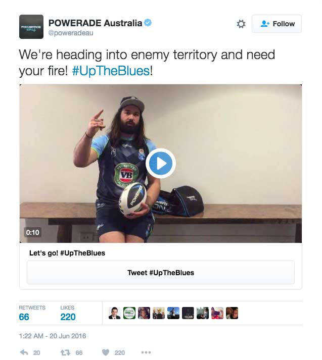 The Holden State of Origin is an annual event for the National Rugby League (NRL), regularly pulling the number one spot on free-to-air television. The series of 3 games between Queensland (the Maroons) and New South Wales (the Blues) unites sports fans across the country. Coca-Cola’s Powerade brand (@poweradeau) is a partner of the NRL, and wanted to leverage the relationship to connect with footy fans.