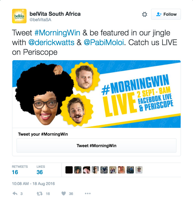 @belVitaSA created a playful campaign around the hashtag #MorningWin, celebrating people who “win” at morning activities. It invited people to Tweet about their own wins, and feature in a radio jingle.