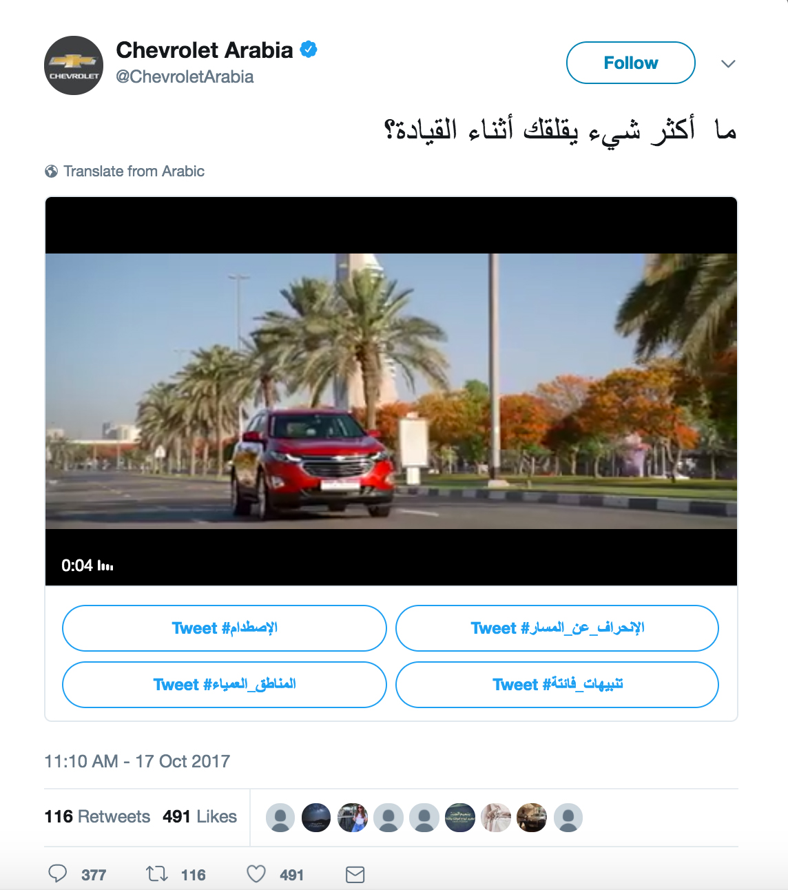 @ChevroletArabia used Conversational Video, engaging people in answering the question “what worries you most while driving?” When people clicked on an answer, they were able to share a Tweet with their own followers, giving the campaign organic reach — and letting @ChevroletArabia address each worry with relevant information about the Equinox.