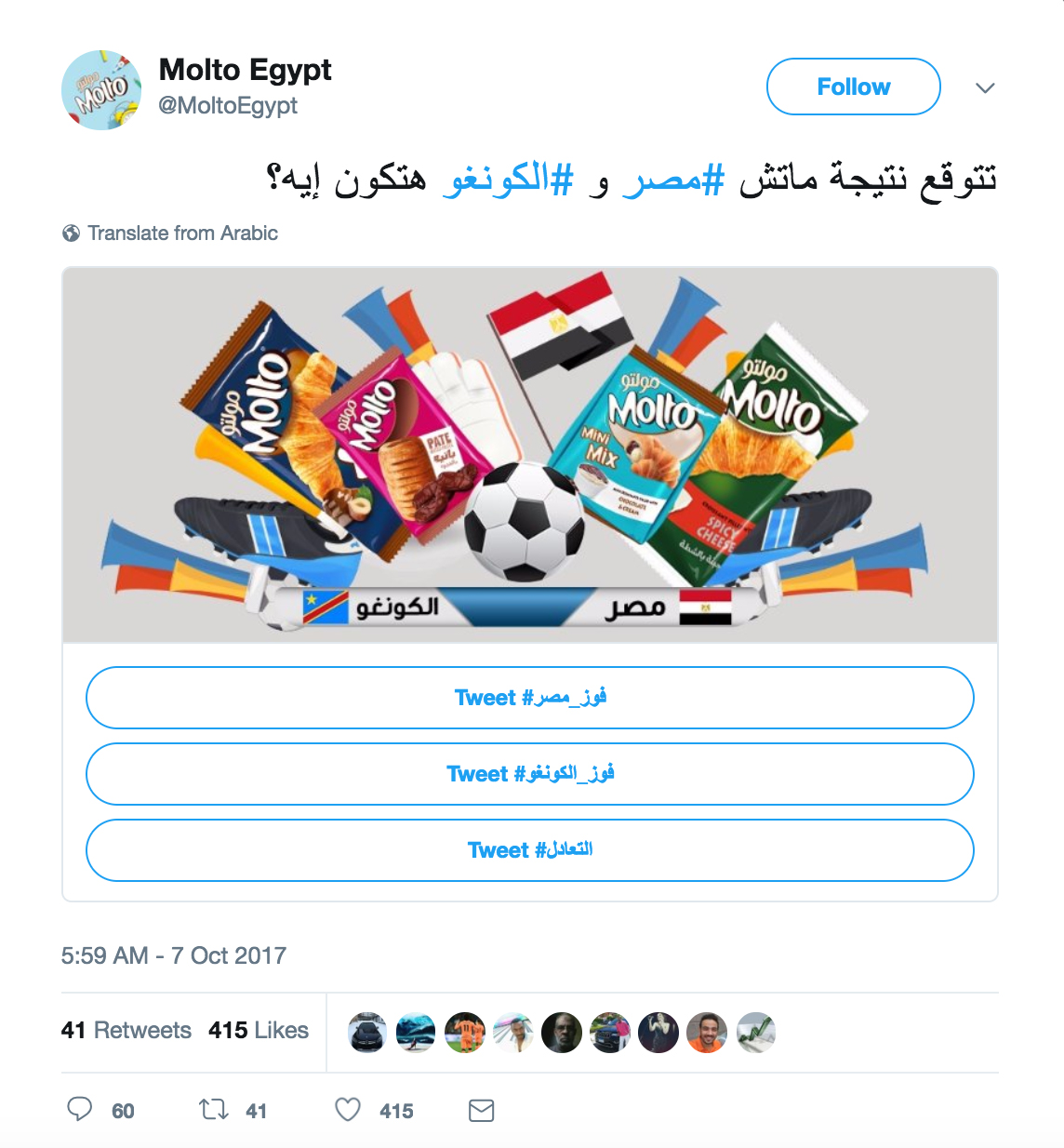 As the Egypt vs. Congo World Cup Qualifier game approached, Molto Egypt (@MoltoEgypt) wanted to drive conversation that would put its snack brand at the center of the excitement. @MoltoEgypt ran Conversational Cards asking people to predict the game’s outcome. As fans shared their predictions, they spread the campaign to their own followers.
