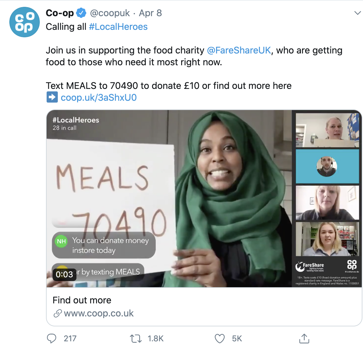 Partnering with Twitter to amplify its message, @coopuk sent out a mass call to action, which encouraged people to become #LocalHeroes by sending donations to FareShare (@FareShareUK) that would go towards getting food to those who need it most.