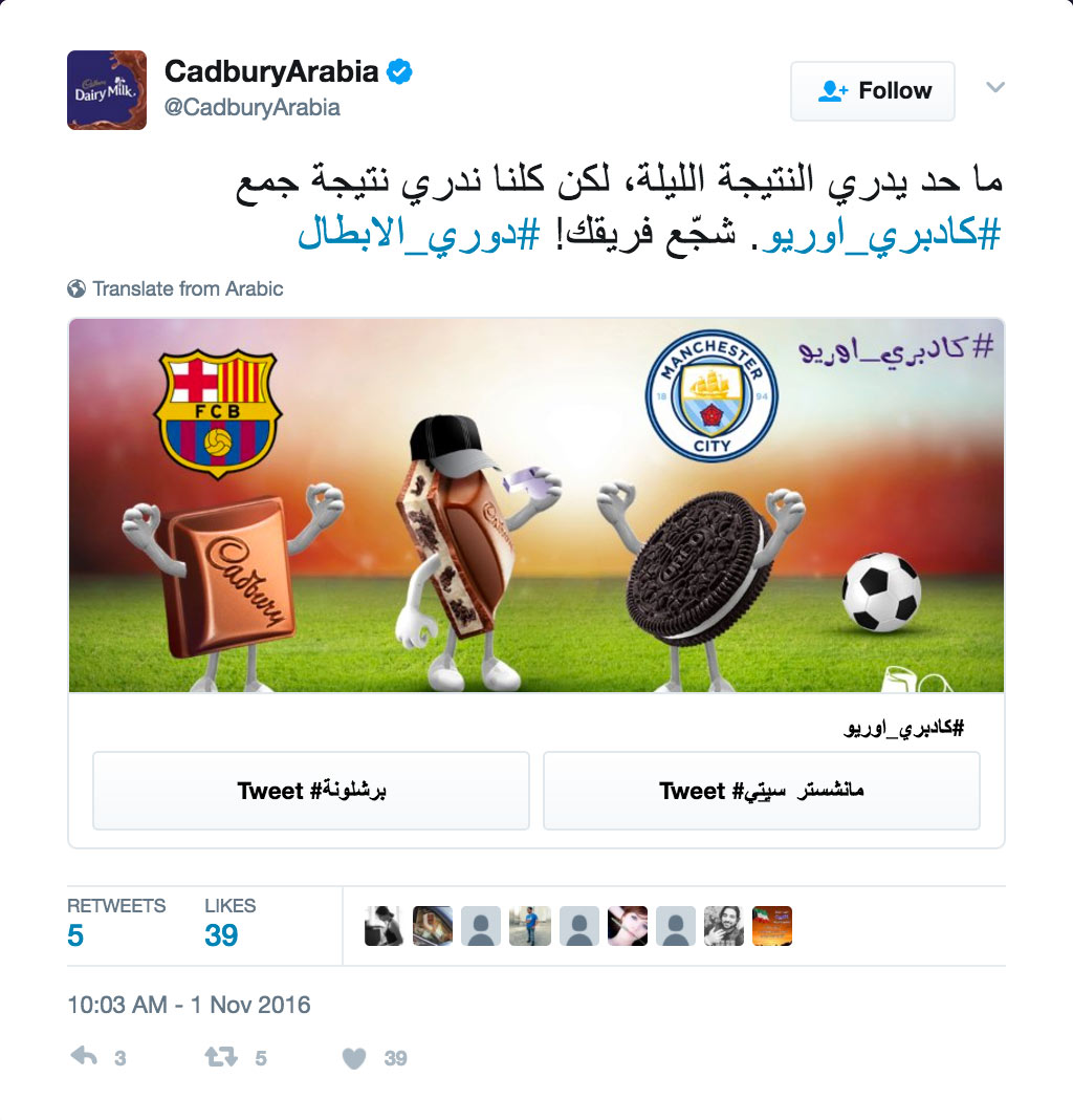 As the brand’s social newsroom focused on responding to trending topics in real time, @CadburyArabia worked with Twitter to shape the conversation around major sporting events with the help of conversational ads.