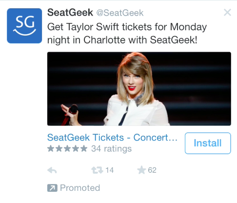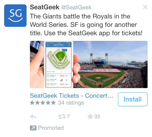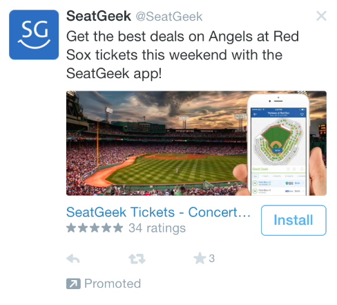 To drive installs, @SeatGeek used Twitter’s App Card, which allows users to install and open the app directly from the Promoted Tweet. For sporting events the company used professional photos of the ballpark or arena to put the ticket buyer in the seat. @SeatGeek frequently included screenshots of the app itself in the creative to show ticket buyers the ease of purchasing on the mobile app.