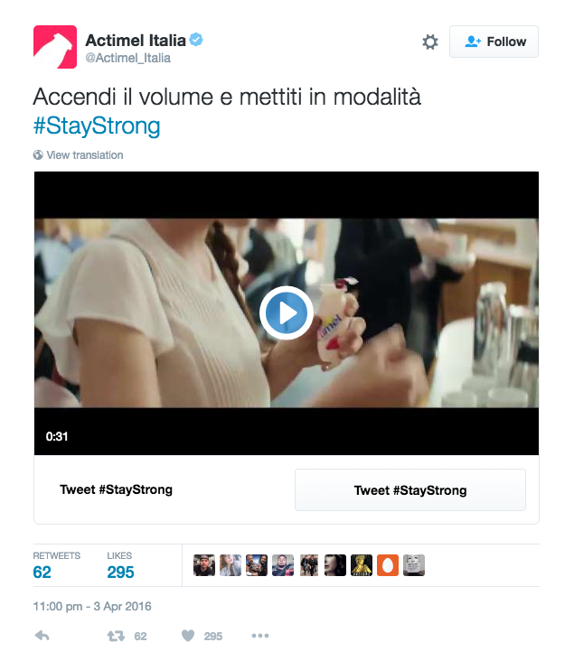 En Italie, @Actimel_Italia a mis en place une mécanique de bot automatique où l’utilisateur Tweete un emoji pour illustrer sa situation (voiture pour illustrer les transports, parapluie pour la météo, etc…) et recevoir la réponse des #StayStrong Brothers, un groupe de musique monté pour l’occasion apportant un peu de bonne humeur à chaque utilisateur.